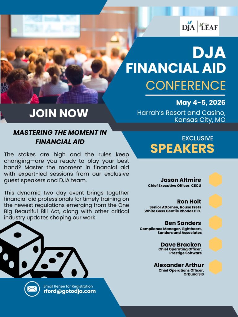 Get ready for two powerful days of insight, strategy and connection at the DJA Financial Aid Conference. This dynamic event brings together financial aid professionals for timely training on the newest regulations emerging from the one Big Beautiful Big Act, along with other critical industry updates shaping our work. Our compliance team will lead practical, actionable training sessions alongside engaging guest speakers who bring fresh perspective and expertise.